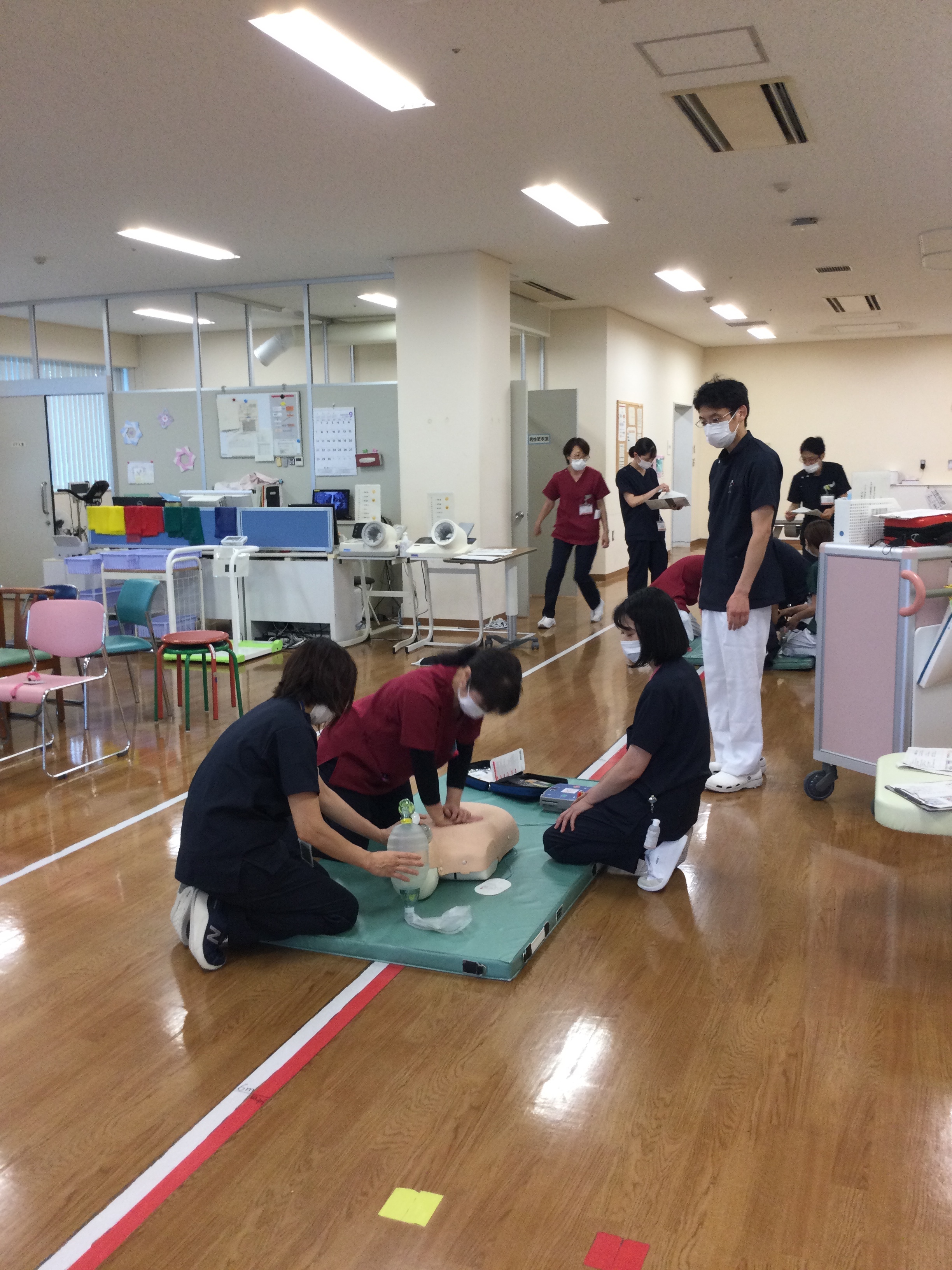 当院リハビリテーション科では、毎年科内スタッフよりファシリテーターを養成し、ファシリテーターが中心となり、一次救命処置(BLS:Basic Life Support)の研修会を年に2回開催しております。BLSの基礎研修会を年に1回、より実践に近づけるために、リハビリテーション室でのリハ介入時の急変患者を想定した応用研修会を年に1回開催しております。(スーパーバイザーとして医療安全推進室の科長に参加いただいております