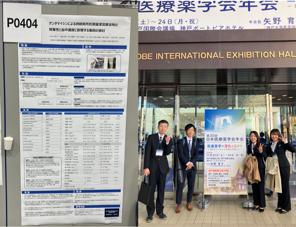 令和7年11月22日(土)~24(月)、神戸国際展示場にて『第35回日本医療薬学会年会』が開催されました。整形外科領域おいて術野で使用する薬剤の血中濃度と副作用に関す症例を集積・解析した成果を発表しました。テーマとしては限られた領域であったため、指導者としては聴講者が集まってくれるか少し心配でしたが、実際には多くの薬剤師が訪れれ、活発な質疑応答が行われました。これからも感染対策チームの一員として、さらなるご活躍を期待しています。